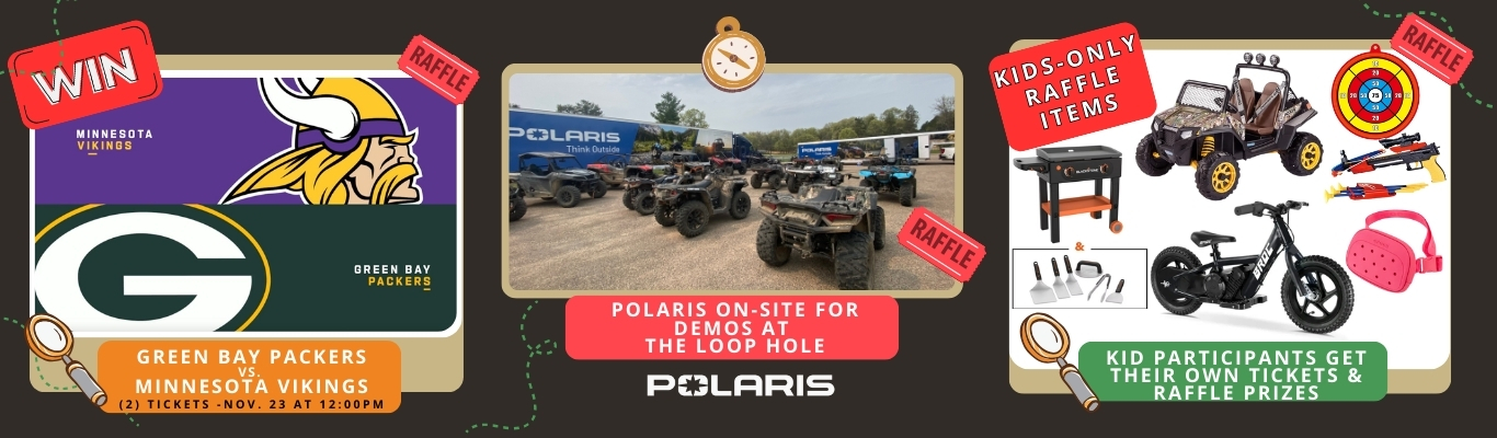 RIDE: 10AM - 3:30PM Head out and ride as soon as you register.Stops will be manned with our activity volunteers from 10AM - 3:30PM. Find all the stops or just some. The more tickets you collect, the more chances to win prizes! Then head back to The Loop Hole whenever you'd like to partake in Polaris machine demos, music, food & fun!